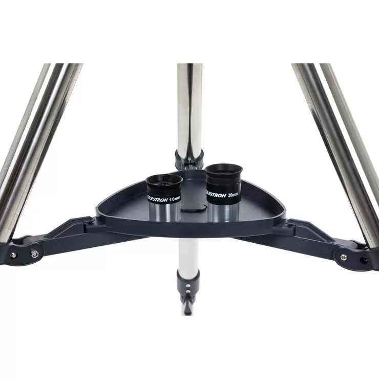 The Celestron AstroMaster 90EQ includes two eyepieces (20mm and 10mm), an erect image diagonal, and a StarPointer™ red dot finderscope. The two eyepieces offer different magnifications so you can view your subject at lower or higher power. StarPointer™ red dot finderscope will help you locate objects and quickly center them in your telescope's eyepiece. Accessories Included The AstroMaster EQ mount comes with two slow motion control knobs so you can make fine pointing adjustments in both Right Ascension and Declination axes, to locate and manually track objects as they appear to drift across the night sky. Manual German Equatorial Telescope The Maksutov-Cassegrain's optical design offers several unique benefits. Instead of a secondary mirror, the MAK features a "secondary spot" of reflective coating applied directly to the inside of the corrector plate. Because of this, the telescope does not require frequent collimation like a Schmidt-Cassegrain. Also, the secondary spot is significantly smaller than a traditional Schmidt-Cassegrain secondary mirror, giving the MAK its signature high-contrast view. The Maksutov-Cassegrain (MAK) is a catadioptric telescope, which means the optical design includes both a lens and a mirror. The light coming through a MAK passes through the corrector lens to the primary mirror and back to a spherical secondary mirror before it hits the eyepiece. Images are bright, sharp and virtually free of chromatic aberration. Maksutov-Cassegrain Optical Design Setting up the telescope is a breeze. Even on your first time out, you can assemble the telescope and it's accessories in just a few minutes. The adjustable tripod legs allow you to customise the telescope's height or place it on raised surfaces like a picnic table. An included accessory tray will help you keep track of eyepieces and other small items while observing. Discover the Solar System and beyond with the Celestron Astromaster Maksutov 90EQ. This telescope is designed for detailed, high contrast views, setting a new standard in beginner telescopes. With its Maksutov-Cassegrain telescope tube and sturdy AstroMaster equatorial mount and tripod, this kit provides stunning views of the planets and the lunar surface, including craters and maria.