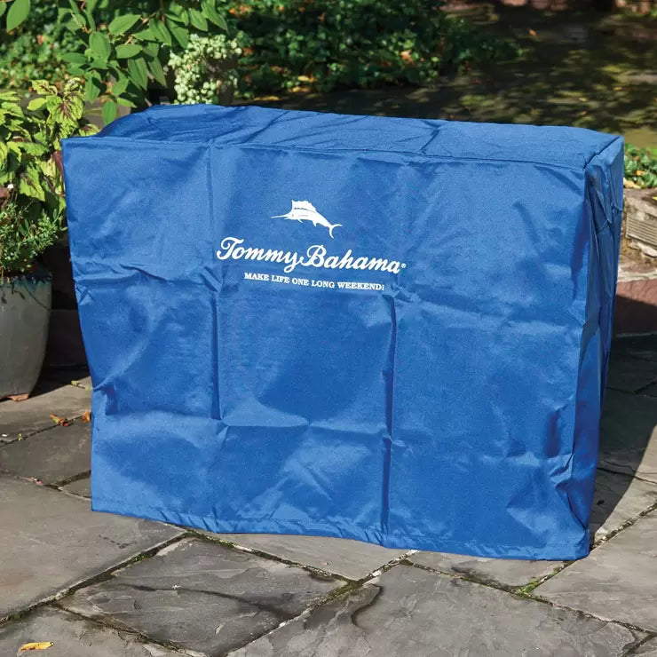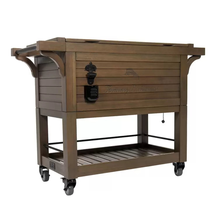 The Tommy Bahama Rolling Wood Cooler 100QT is ideal for outdoor parties on the patio, deck, pool side or garden. Fitted with stainless steel hardware with safety folding hinges on the lid, as well as a bottle opener and cap catcher for added convenience. Heavy duty handles double as towel bars, ideal for poolside use. The Tommy Bahama Rolling Wood Cooler 100QT is made with caster wheels allowing for swift maneuvering, while a lower shelf holds your party essentials. Not to worry when the cooler is not in use or in the colder months, included is a weather proof cover to keep your cooler protected until its next use.